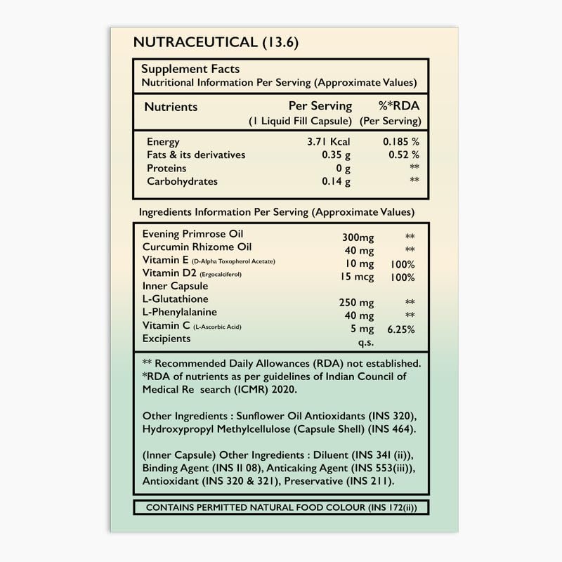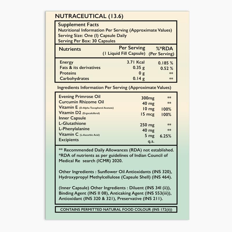- Dual-Action Capsules: The outer capsule contains Evening Primrose Oil, Curcumin Rhizome Oil, while the inner capsule includes L-Glutathione, L-Phenylalanine, and Vitamin C, offering comprehensive skin nourishment and care.