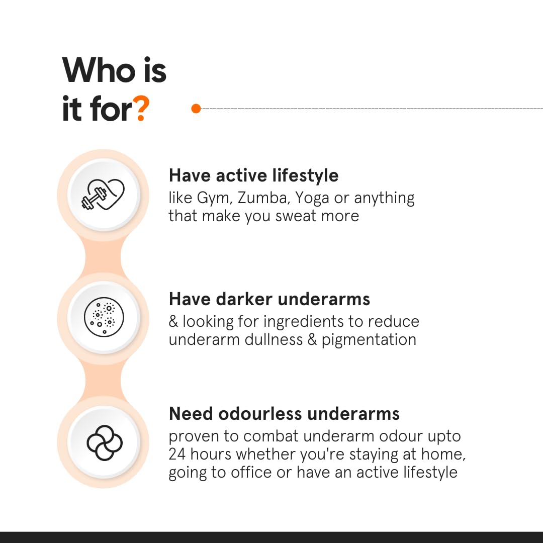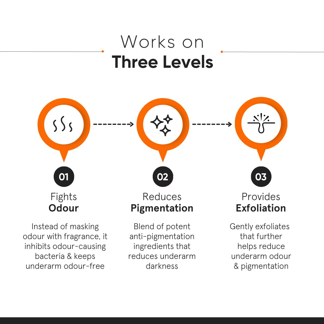 - Gentle Exfoliation - Combination of AHAs & BHA provides gentle multilevel exfoliation and promotes natural cell turnover. It helps reduces dark spots & acheive even toned underarms, revealing smoother and revitalised skin
