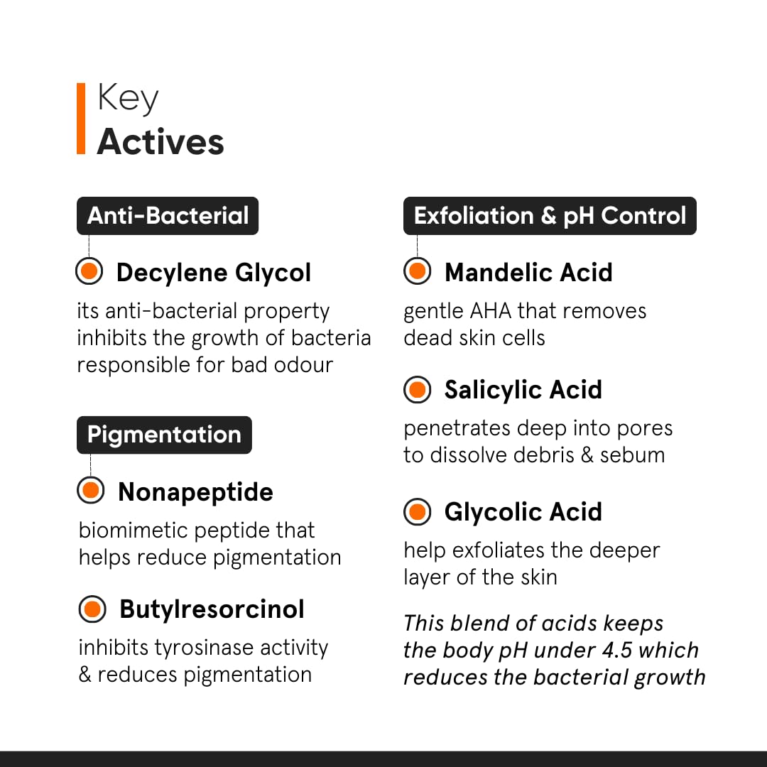 - Neutralises Bad Odour Causing Bacteria - Decylene Glycol is an antibacterial molecule which controls the growth of the bacteria primarily responsible for breakdown of sweat causing volatile organic compounds with bad odour. Additionally, Glycolic & Mandelic acid reduce the pH of the skin which help in further reducing bacterial growth.