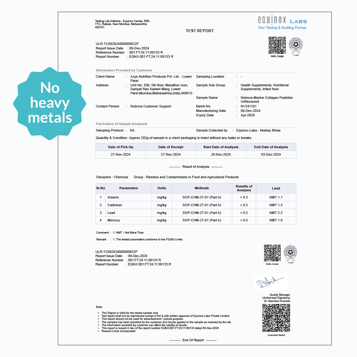 - MARINE COLLAGEN PEPTIDES: This highly pure collagen powder is an alternative to bovine (cow) sources. Nutrova’s hydrolyzed marine collagen peptides has smaller chains of collagen that the body can easily absorb and use. It is also third-party tested for heavy metals.